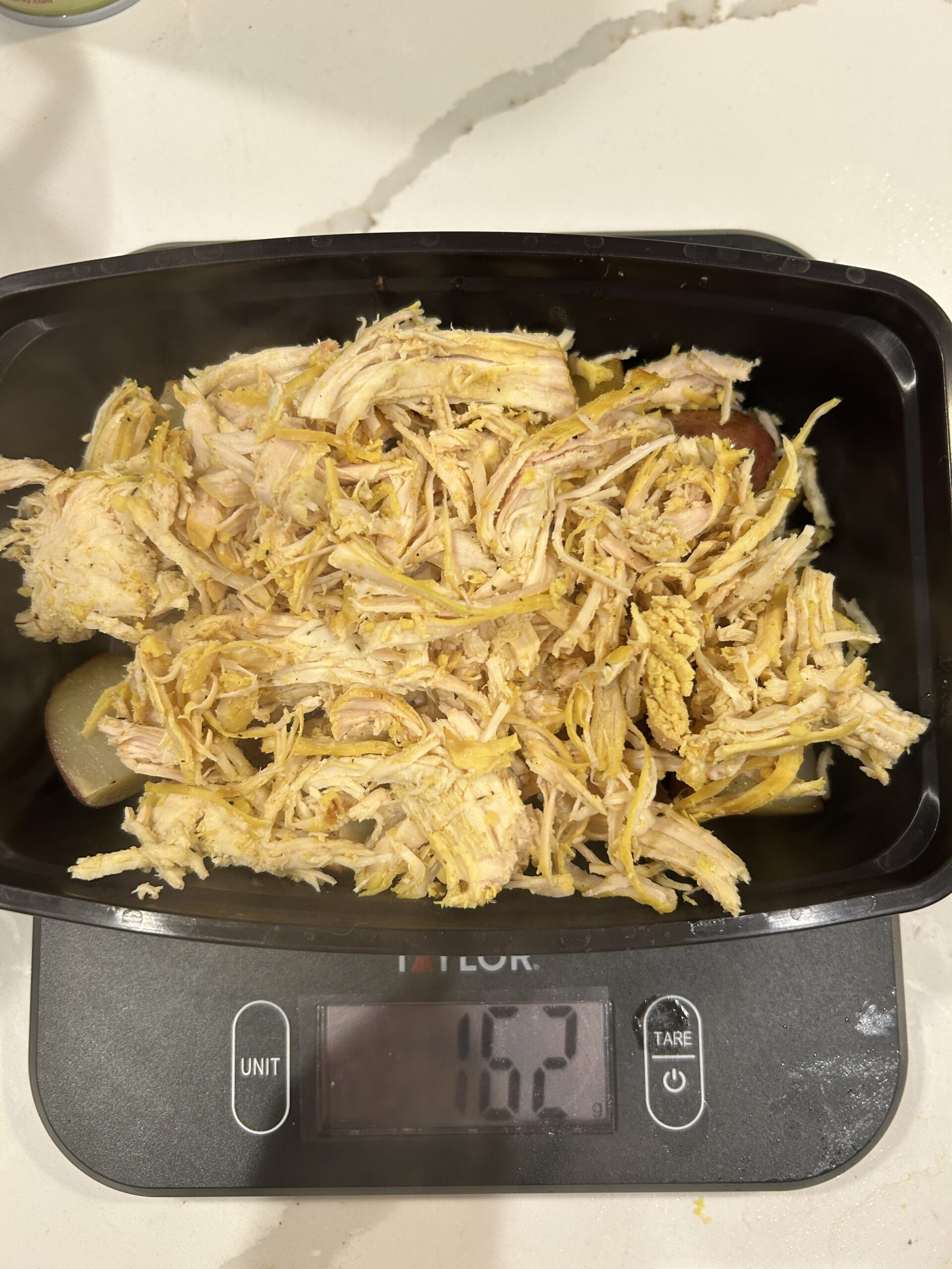 This shredded chicken meal prep goes way beyond just hitting your macros. Cayenne pepper delivers capsaicin, which may give a modest boost to metabolism and fat oxidation, stimulate digestive juices for better digestion, and help reduce inflammation. Garlic provides allicin—the powerful compound behind many of its benefits for immune support and heart health. For maximum allicin, mince or crush fresh garlic and let it sit for 10 minutes before using. Turmeric, added directly to the simmering chicken broth, brings curcumin—a potent anti-inflammatory compound with antioxidant properties that may support joint health, brain function, and metabolic health. For best absorption, pair it with a pinch of black pepper (already in most chicken seasonings or easy to add). Chicken breast supplies highly bioavailable lean protein with all essential amino acids, making it excellent for muscle maintenance and promoting lasting satiety. Finally, the roasted potatoes, corn, and extra green beans add fiber, potassium, and high volume to help you stay full longer on fewer calories.